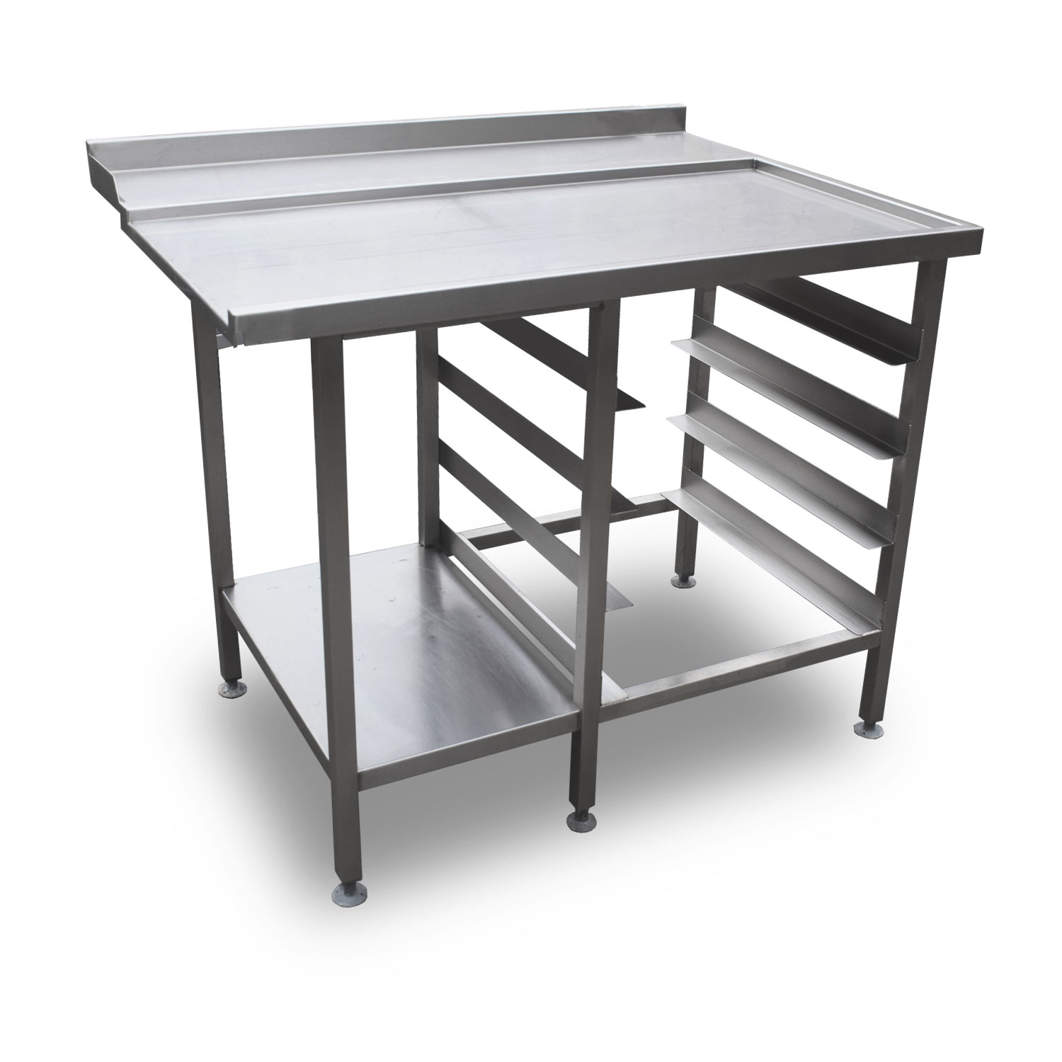 Stainless steel table designed to be compatible with a pass through dishwasher. Features upstand and racking suitable for 500×500 dishwasher baskets.