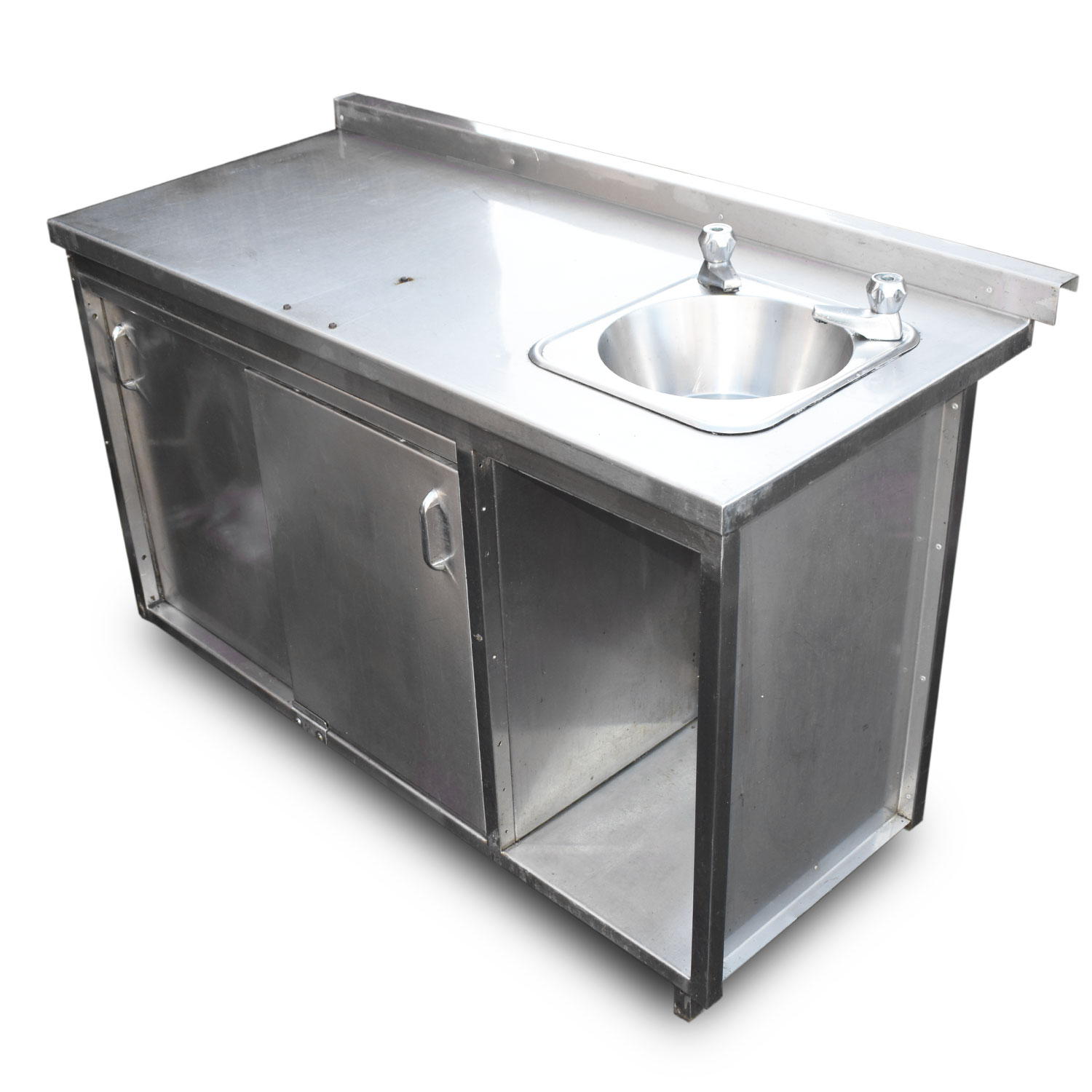 Stainless steel unit featuring upstand, small hand wash sink and storage cupboards with sliding doors. Ideal for use in commercial kitchens. SKU: RHCs2078