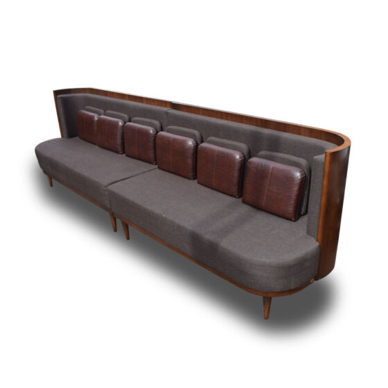 Provide comfort for your guests with this stylish back booth bench seating. Featuring fabric upholstery and built in brown leather cushions. Comes in two separate pieces that can be clipped together to create one back bench. Ideal for use in any bar or r