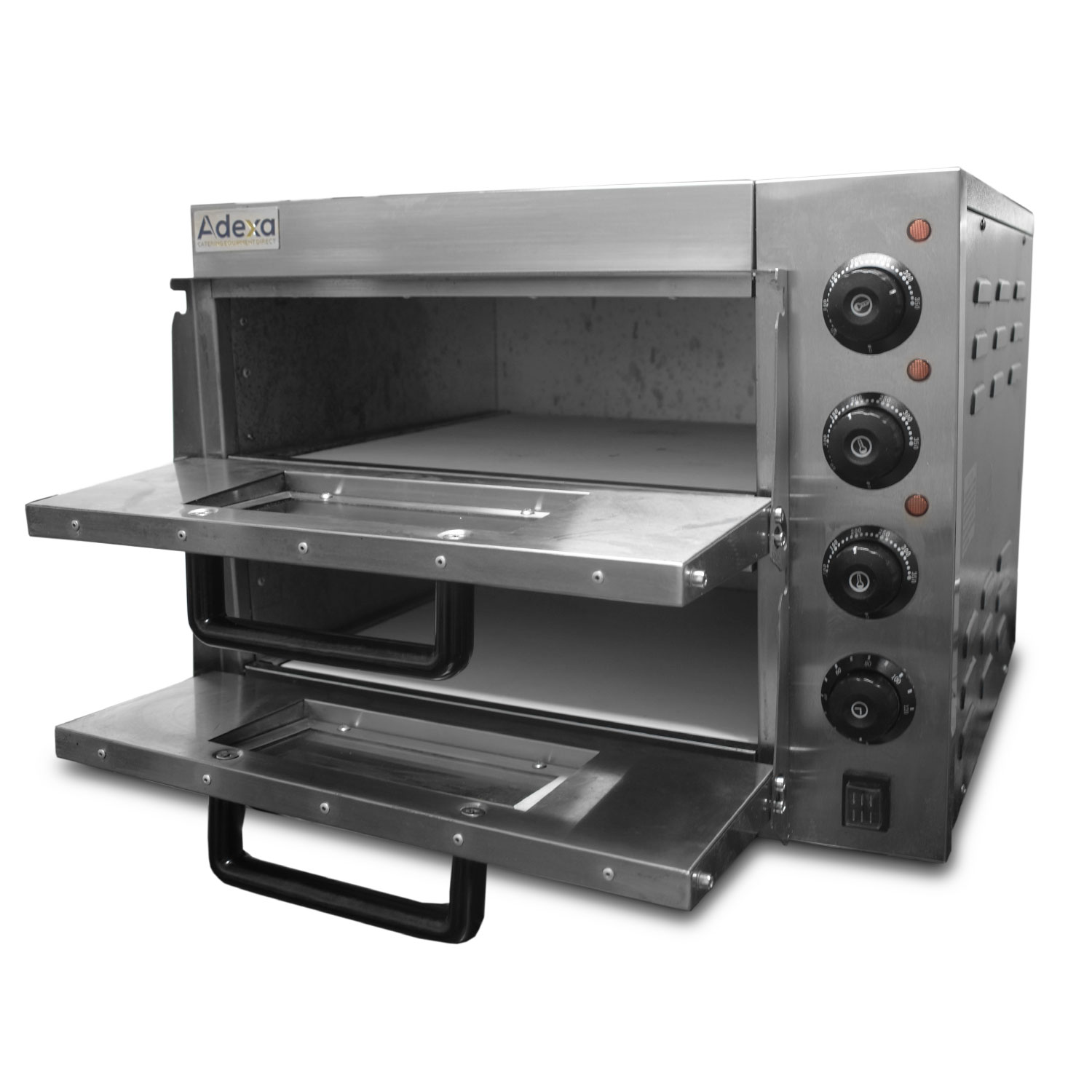 This counter top twin deck electric pizza oven made by Adexa is Ideal for smaller food establishments. Features include, 2 internal decks measuring at 400 x 400mm, stainless steel construction, quality elements providing even heat distribution, smooth drop down doors with viewing window and three independent, adjustable thermostats with temperature ranging up to 350’C. This pizza oven is also ideal for cooking a variety of other foods such as ciabatta, naan and garlic bread, as well as lasagne, jacket potatoes, pies, pasties and pastries.