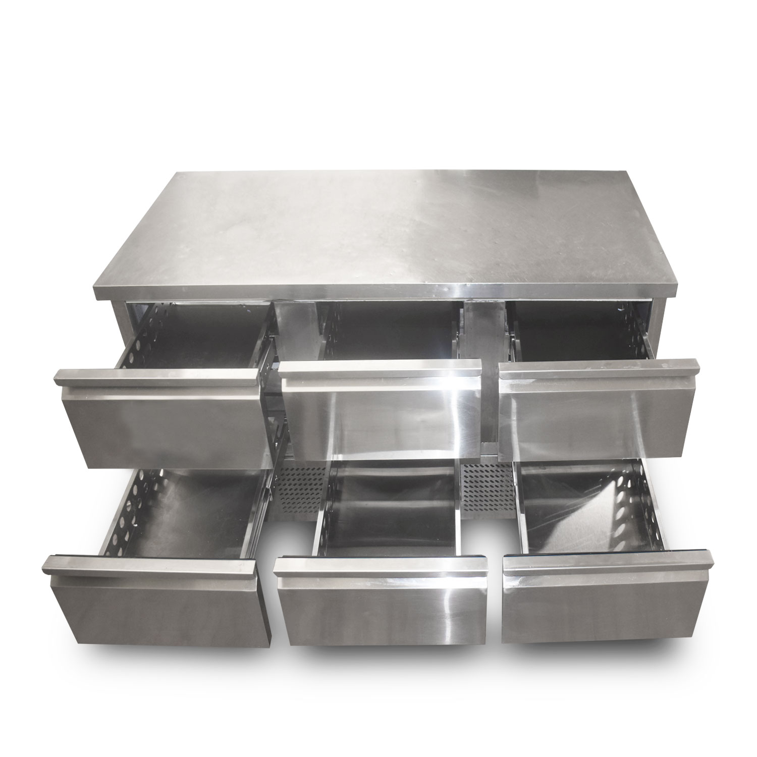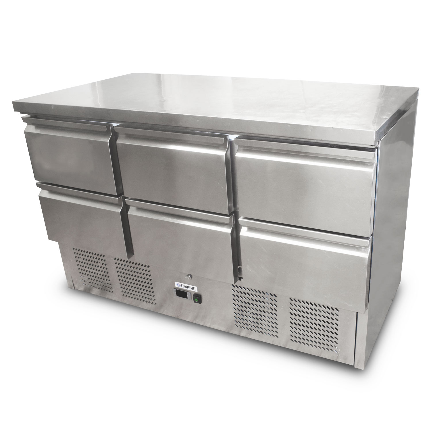 This Empire 6‑Drawer Prep Counter is a refrigerated unit that features 6 fully extendable draws heavy‑duty drawers that are on runners to allow for quick and easy access to storing and removing food from each draw.
