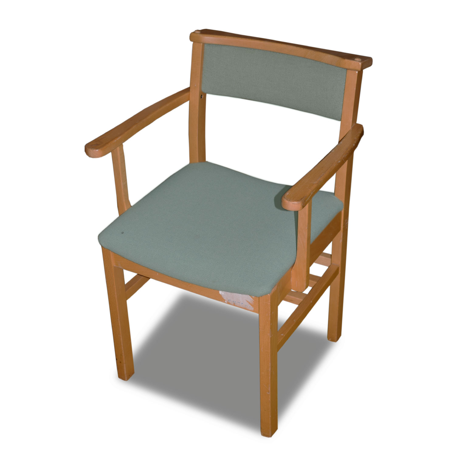 Wood framed arm chairs with light green upholstery. Ideal for use in reception/waiting areas. Price is per chair.
